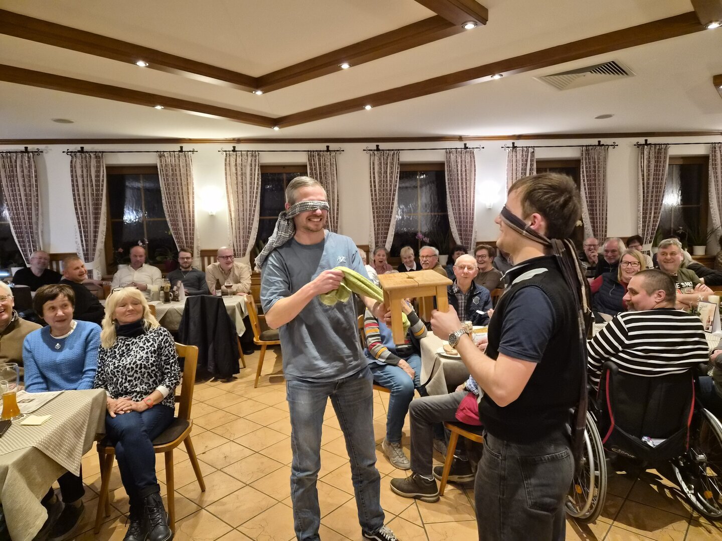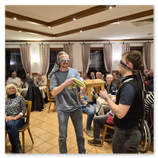 Zwischendurch sorgte Sepp Lösch mit Gedichten des ehemaligen Heimatpflegers „Binder Hansl“ (z.B. „Wurstsuppnfoahrn“) für Schmunzler, während Josef Schmaußer das Publikum mit interaktiven Spielen wie „Hanserl Hey“ bei bester Laune hielt.