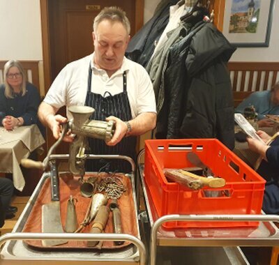Handwerk zum Anfassen und GenießenWirt Dieter Schmidt und Martin Lotter präsentierten historisches Handwerkszeug, das teilweise über 100 Jahre alt war. Von schweren Hackbeilen über Schabeglocken bis hin zu antiken Fleischwölfen wurde deutlich, wie hart die Arbeit in der Wurstkuchl früher war.